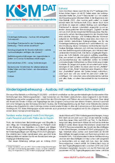 Die aktuelle KomDat-Doppelausgabe beschäftigt sich mit den Ergebnissen der Kita-Statistik 2020 und dem anhaltenden Ausbau sowie dem zukünftigen Platzbedarf in diesem Arbeitsfeld, der sich angesichts zu erwartender demografischer Entwicklungen abzeichnet. Zugleich deutet sich ab 2025 mit der möglichen Einführung eines Rechtsanspruchs auf ein Ganztagsangebot in der Grundschule eine nächste bildungs- und familienpolitische Mammutaufgabe an. Welche Ausbaustrategien die Länder bei den Ganztagsangeboten verfolgen, widmet sich ein zusätzlicher Beitrag. Weitere Beiträge befassen sich mit den Inobhutnahmen und den Gefährdungseinschätzungen, also mit dem intervenierenden Kinderschutz. Die hierzu vorgelegten Ergebnisse der KJH-Statistik sind jedoch auffällig unauffällig. Dies verwundert vor allem mit Blick auf Ergebnisse einer „8a-Zusatzerhebung“ im Umfeld coronabedingter Maßnahmen zur Einschränkung sozialer Kontakte. Abgerundet wird das Heft mit Einblicken in die Datengrundlage zu den gemeinsamen Wohnformen für alleinerziehende Mütter/Väter und ihre Kinder.