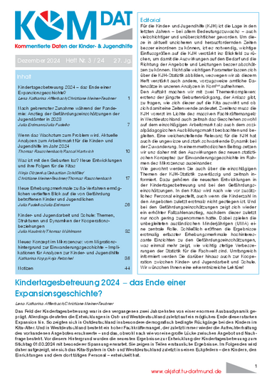 Die neuesten Daten zu den Kindertageseinrichtungen zeigen einen erstaunlichen Befund: Es werden zwar nach wie vor neue Kitas eröffnet und zusätzliches Personal eingestellt, allerdings wurde im Jahr 2024 erstmals seit 2006 kein Zuwachs an Kindern in den Angeboten beobachtet. In den ostdeutschen Flächenländern ist dies zwar aufgrund des gut ausgebauten Systems und der demografischen Veränderungen bereits seit wenigen Jahren zu beobachten. Für die westdeutschen Flächenländer und die Stadtstaaten ist wegen der bestehenden Lücke zwischen Angebot und den durch das DJI erhobenen elterlichen Bedarfen nach wie vor von einem hohen Platzmangel auszugehen. Möglicherweise zeigen sich hier die Auswirkungen des erheblichen Fachkräftemangels oder bereits der jüngsten Geburtenrückgänge. Abzuwarten bleibt, ob dies die ersten Anzeichen einer Wende für das Kita-System sind.