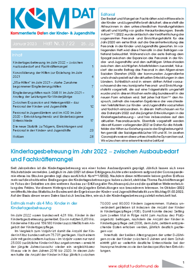 KomDat Jugendhilfe Heft 3/2022: Personal in der Kinder- und Jugendhilfe im Fokus der aktuellen Ausgabe sowie neuste Ergebnisse zu Kita, HzE und den Eingliederungshilfen