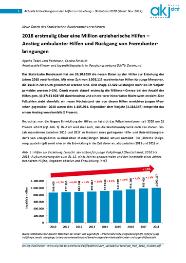 Mit einer Zahl von 1.003.117 erzieherischen Hilfen für junge Menschen, die 2018 in Anspruch genommen worden sind, sind knapp 17.500 Leistungen mehr als im Vorjahr gemeldet worden (+2%). Damit wurde aktuell erstmalig die Millionen-Grenze bei der Anzahl der Hilfen gem. §§ 27/41 SGB VIII durchbrochen und ein weiterer historischer Höchstwert erreicht. Nach den deutlichen Fallzahlenzunahmen zwischen 2015 und 2017 lässt die Wachstumsdynamik jedoch nach.